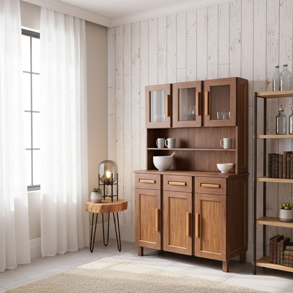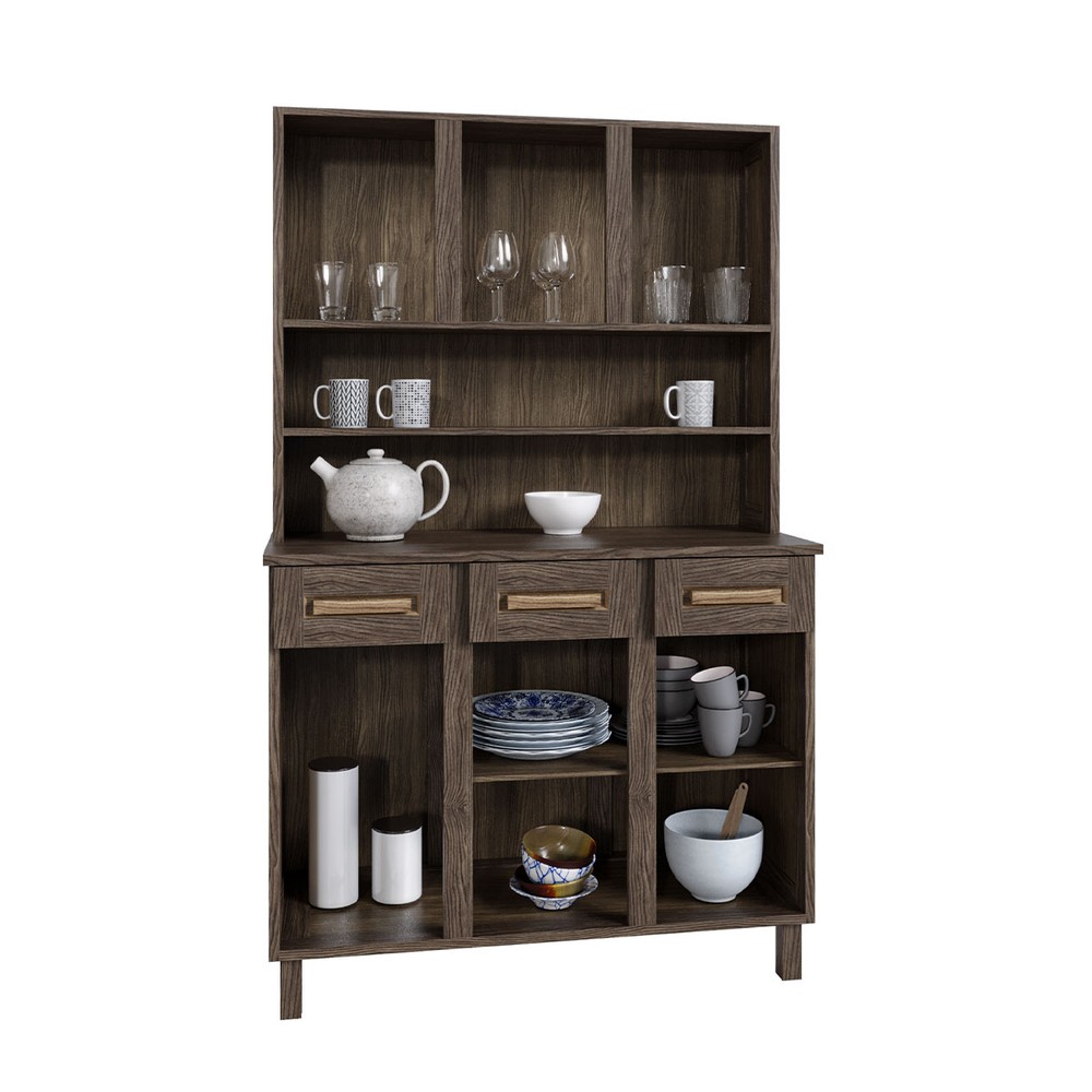 O(a) Armário de Cozinha Bahia 6 Portas 3 Gavetas com Vidro Natural - Rodmóveis é produzido em Madeira Maciça e HDF na escala de brilho Fosco, e possui um grau de dificuldade de montagem: Médio.