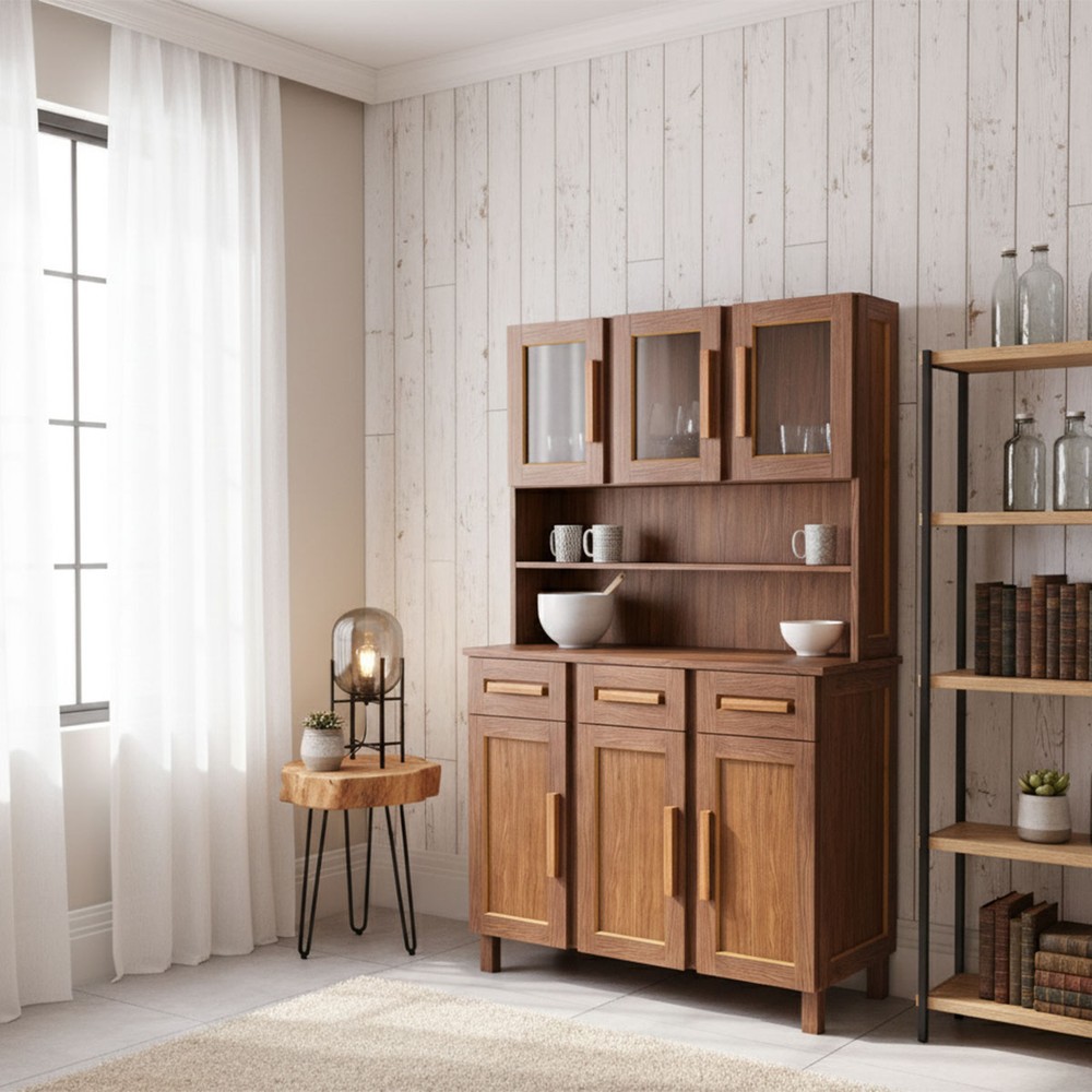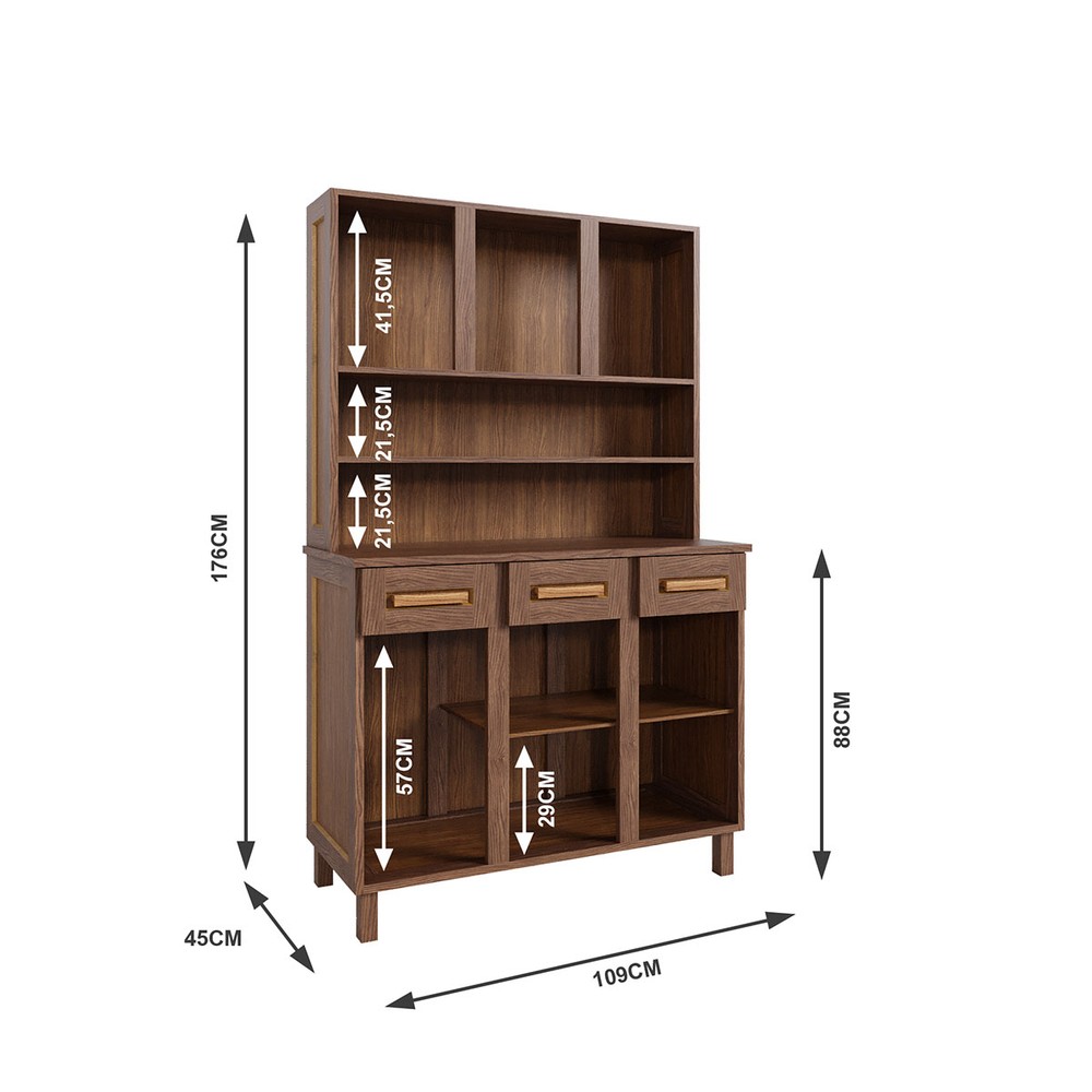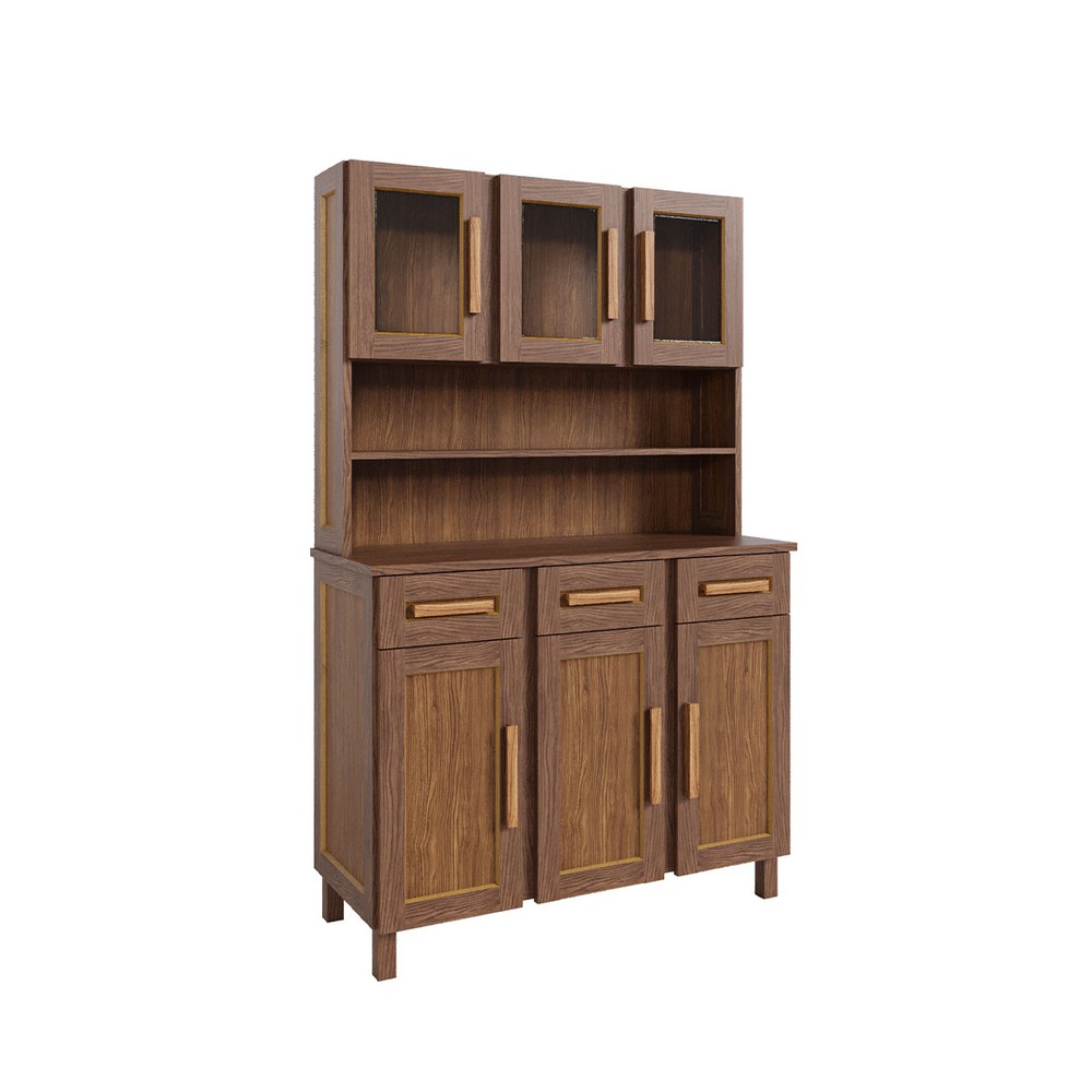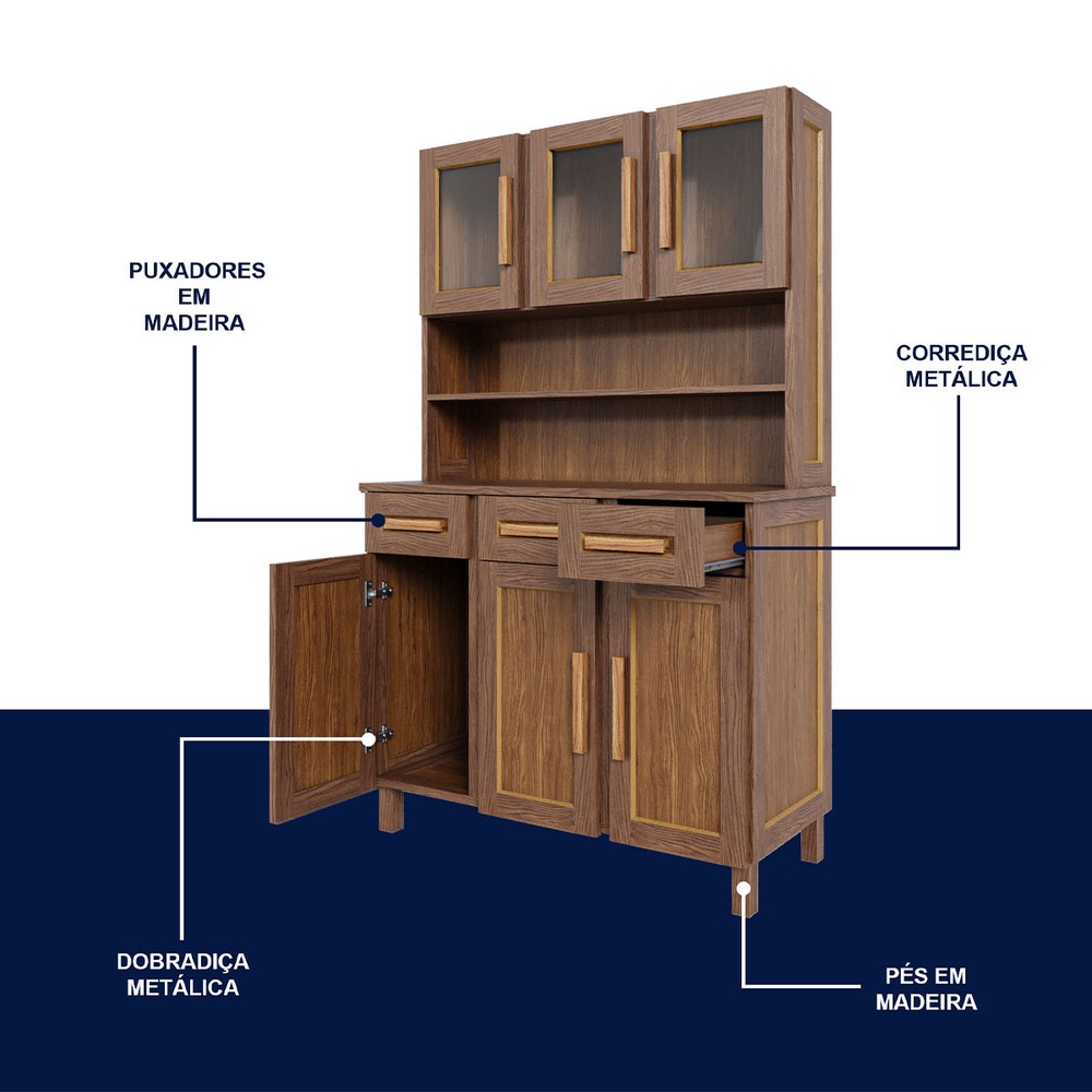 O(a) Armário de Cozinha Bahia 6 Portas 3 Gavetas com Vidro Ypê - Rodmóveis é produzido em Madeira Maciça e HDF na escala de brilho Fosco, e possui um grau de dificuldade de montagem: Médio.