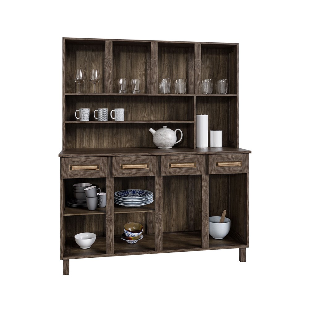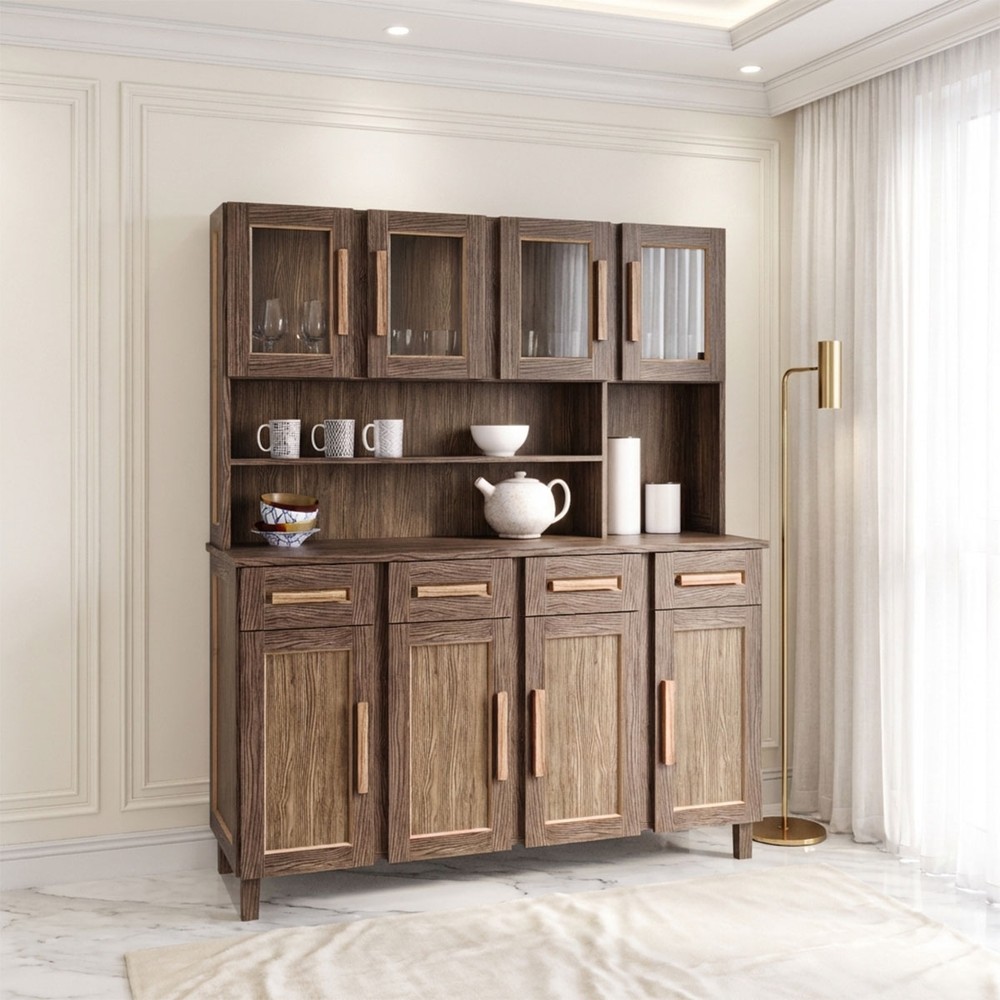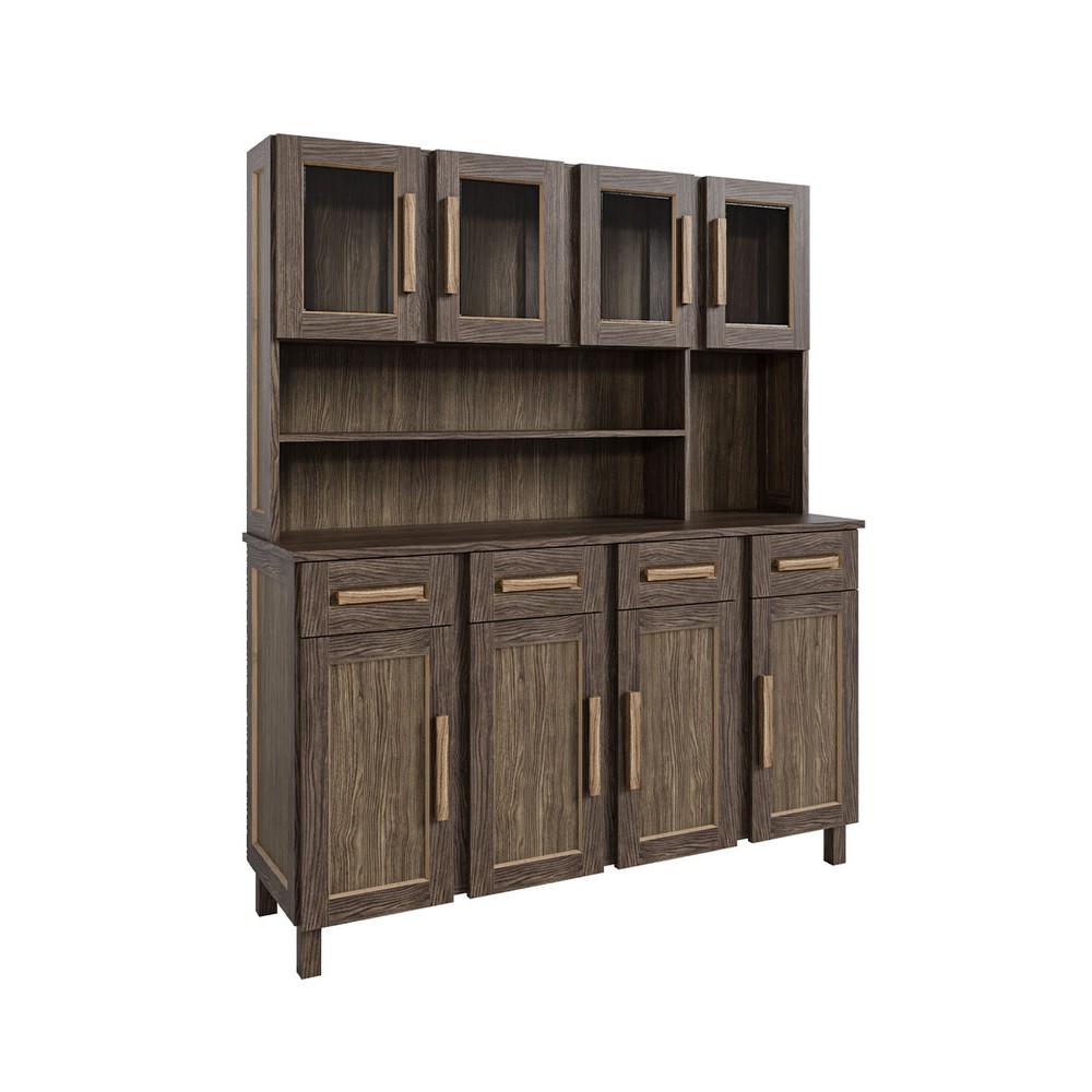 O(a) Armário de Cozinha Maranhão 8 Portas 4 Gavetas com Vidro Imbuia Natural - Rodmóveis é produzido em Pinus e HDF na escala de brilho Semi-Brilho, e possui um grau de dificuldade de montagem: Médio.