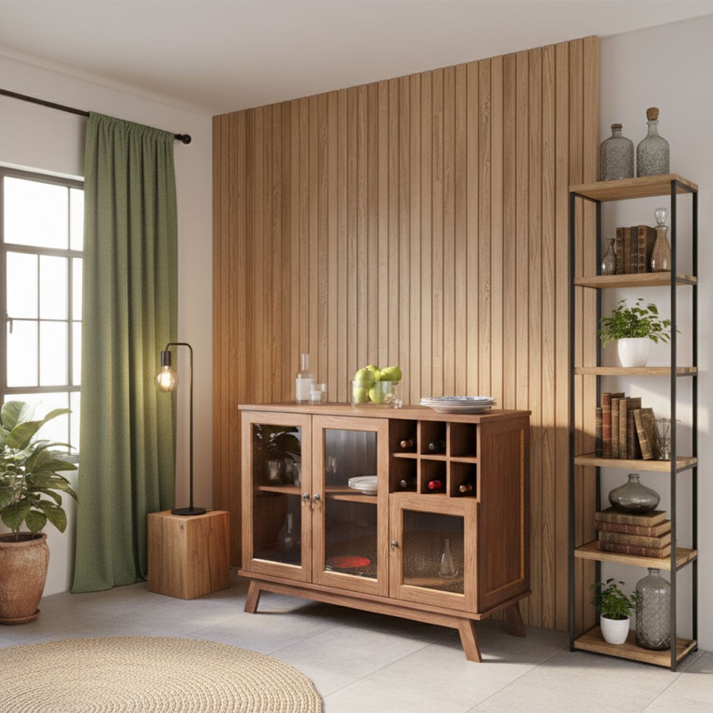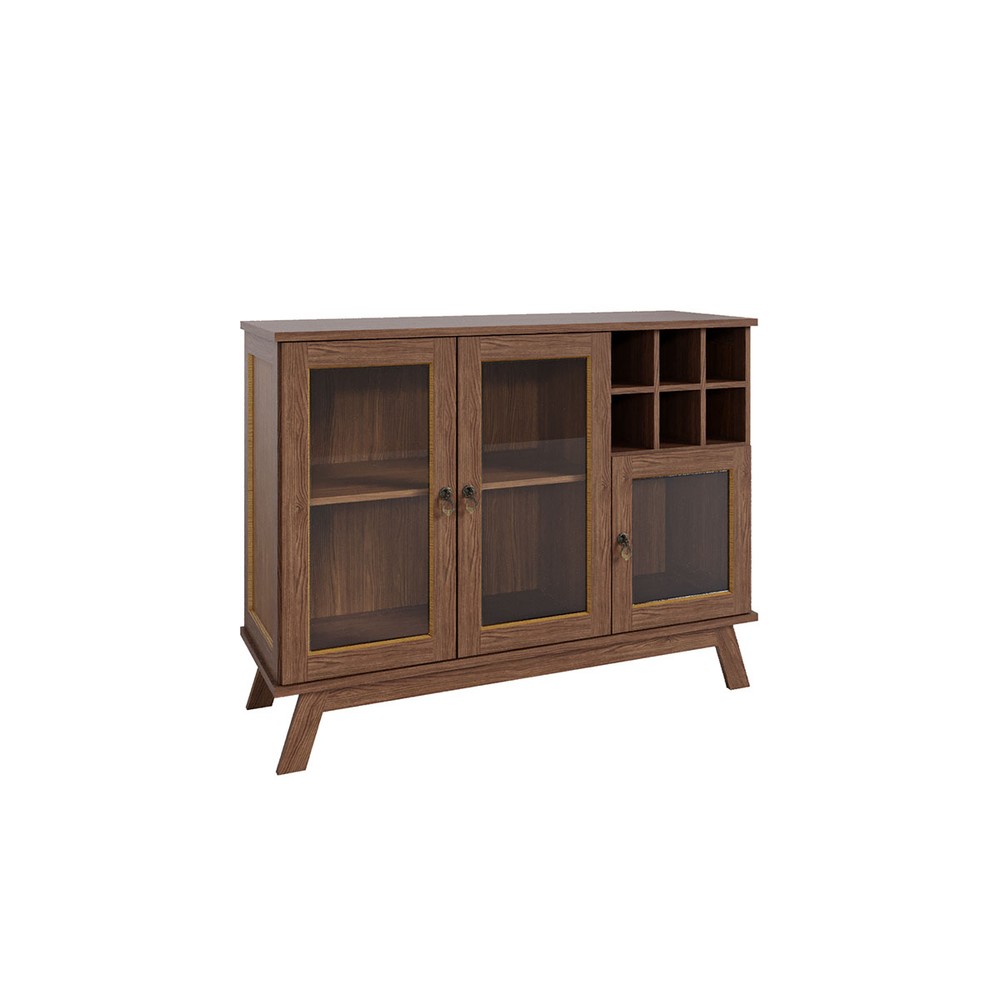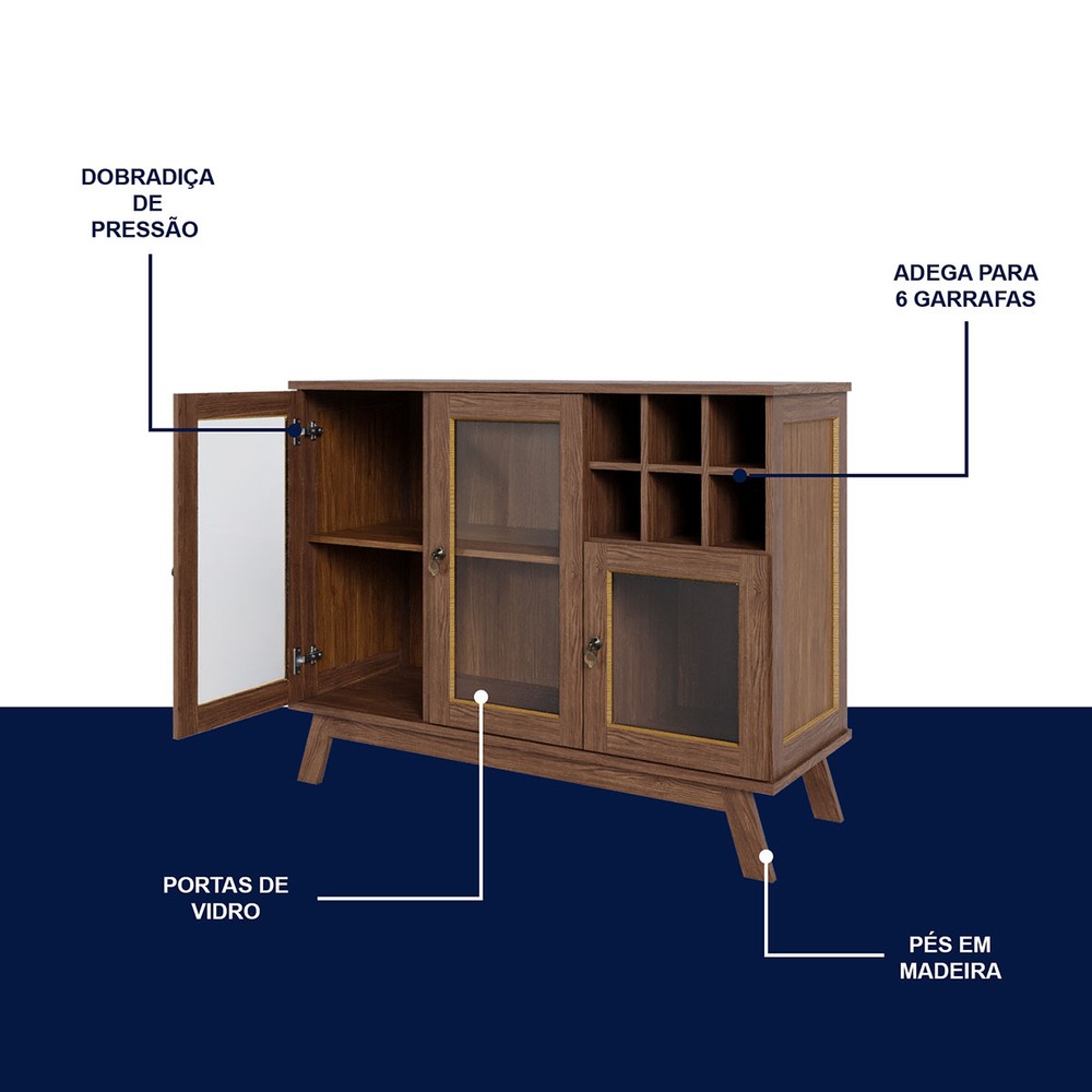 O(a) Balcão Buffet Paris 3 Portas 1 Prateleira com Vidro Ypê - Rodmoveis é produzido em MDP e Pinus na escala de brilho Fosco, e possui um grau de dificuldade de montagem: Médio.