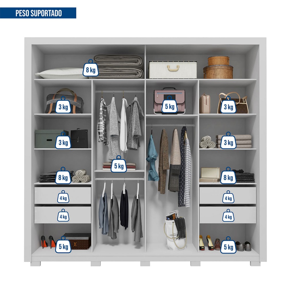 O(a) Guarda-Roupa Casal Romanus 2 Portas 4 Gavetas com Espelho Branco - Caemmun é produzido em MDP na escala de brilho Fosco, e possui um grau de dificuldade de montagem: Difícil.