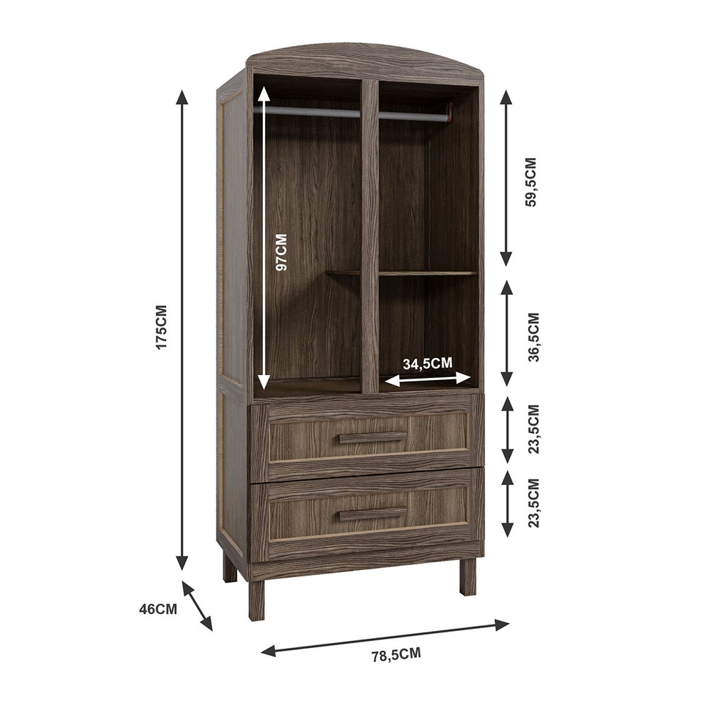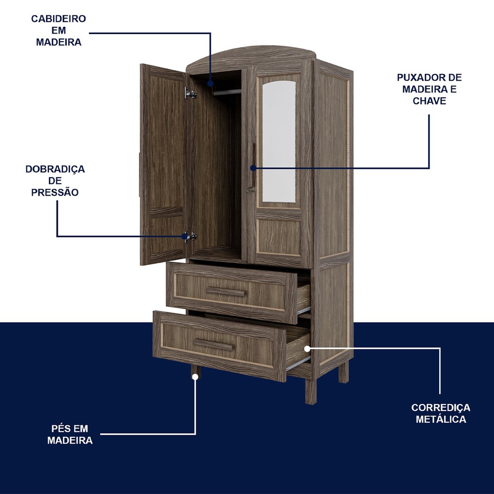 O(a) Guarda-Roupa Solteiro Bacuri 2 Portas 2 Gavetas com Espelho Imbuia Natural - Rodmóveis é produzido em Pinus e HDF na escala de brilho Fosco, e possui um grau de dificuldade de montagem: Médio.